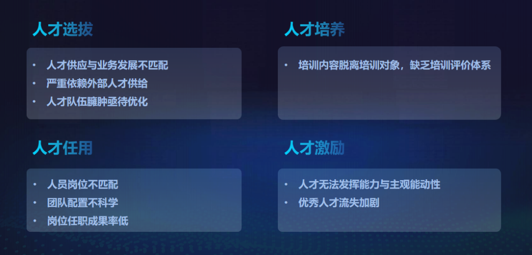 人才供應與業務發展不匹配:人才隊伍臃腫,人員崗位不匹配,團隊配置不科學,導致崗位任職成果率低。 -
